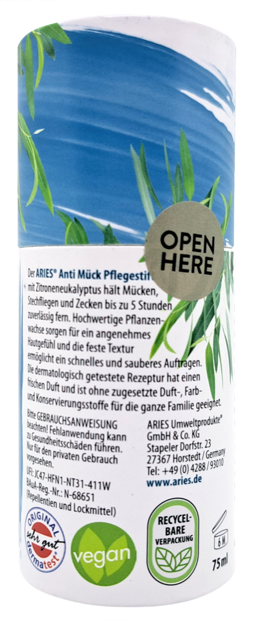 - Beschreibung Der ARIES® Anti Mück Pflegestift hält Mücken, Stechfliegen und Zecken bis zu 5 Stunden zuverlässig fern. Hochwertige Pflanze… Mehr