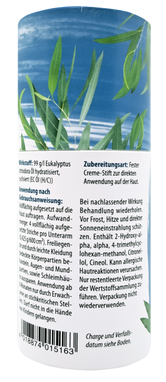 Anwendung: Vollflächig aufgesetzt auf die Haut auftragen. Aufwandmenge: 4 vollflächig aufgesetzte Striche pro Unterarm. Freiliegende und durch leichte Kleidung bedeckte Körperpartien behandeln. Augen- und Mundpartien, sowie Schleimhäute aussparen. Anwendung ab 6 Monaten nur durch Erwachsene an stichkritischen Stellen. Darf nicht in die Hände von Kindern gelangen. Bei nachlassender Wirkung Behandlung wiederholen. Vor Frost, Hitze und direkter Sonneneinstrahlung schützen. Nur restentleerte Verpackung der Wertstoffsammlung zuführen. Verpackung nicht wiederverwenden.