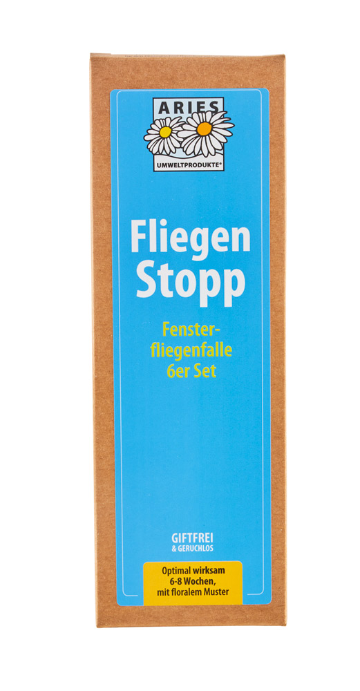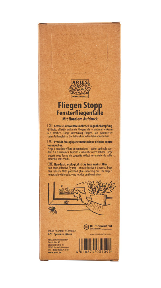 Die Fliegen Stopp Fensterfliegenfalle kann hinter den Gardinen oder Blumen direkt am Fenster befestigt werden. Die giftfreie Fliegenfalle ist 6-8 Wochen optimal wirksam. Mit patentierter Leim-Auffangleiste und floralem Muster.