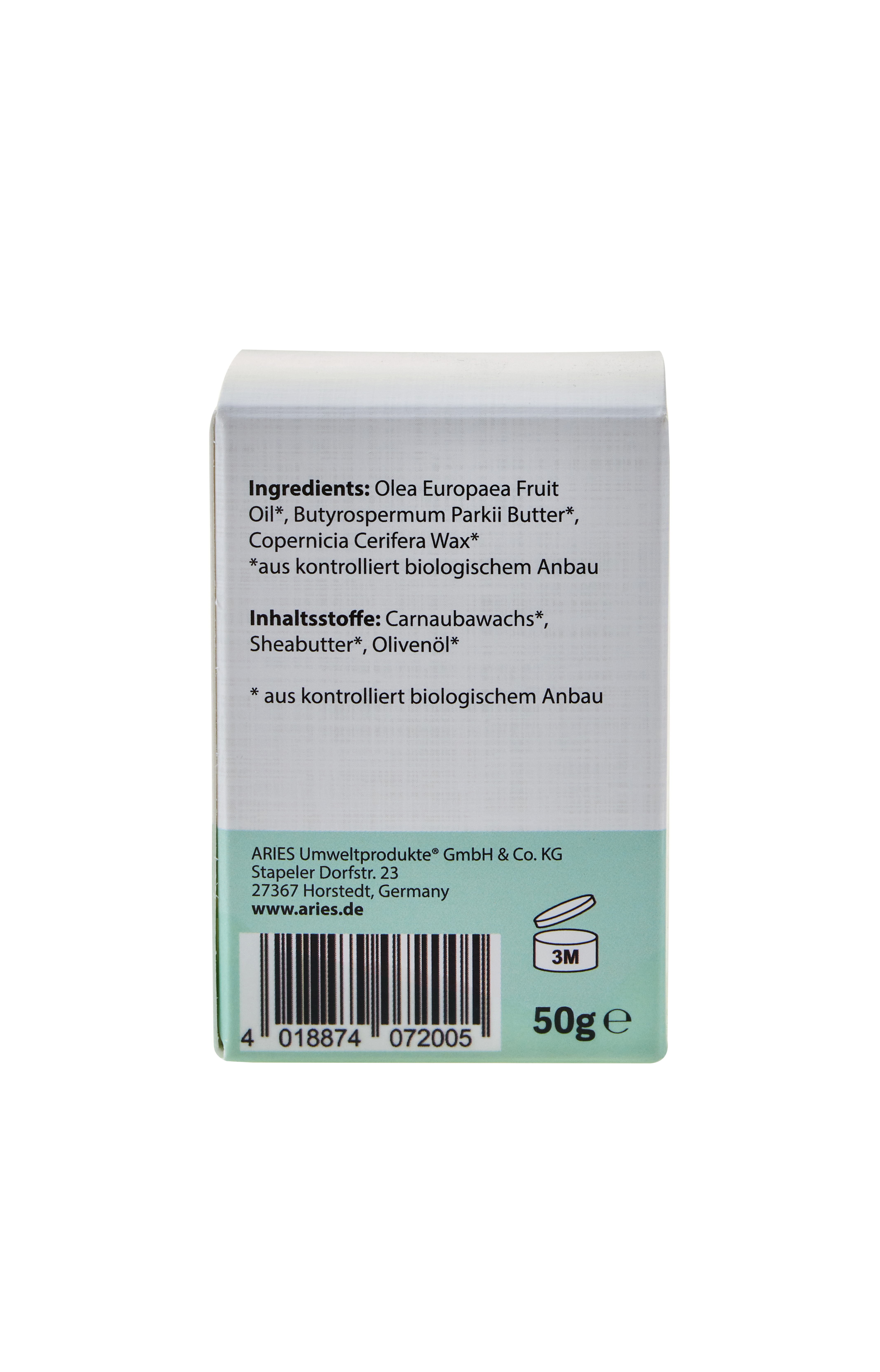 Inhaltsstoffe: Sheabutter roh*, Carnaubawachs*, Natives Olivenöl extra*