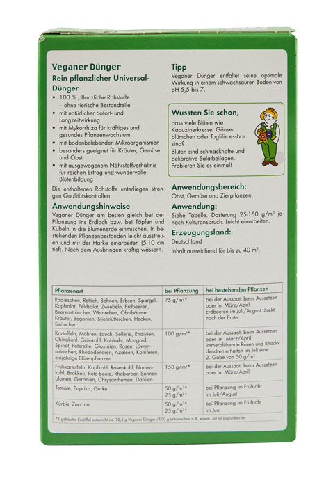 Hinweise: Der Vegane Dünger entfaltet seine optimale Wirkung in einem schwachsauren Boden von pH 5,5 bis 7.