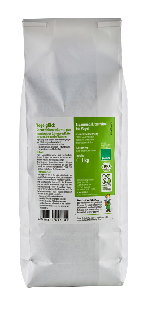Sonnenblumenkerne stecken voller gesunder Fette und sind besonders eiweißreich, ein ideales Gartenvogelfutter für die ganzjährige Zufütterung, auch während der kräftezehrenden Phase zwischen Nestbau und Aufzucht des Nachwuchses. Besonders schmecken die ungeschälten Bio-Sonnenblumenkerne aus heimischem Bioland-Anbau Hartfressern wie Finken, Meisen und Sperlingen. So bringen Sie Ihre Gartenbewohner gut durchs Jahr!