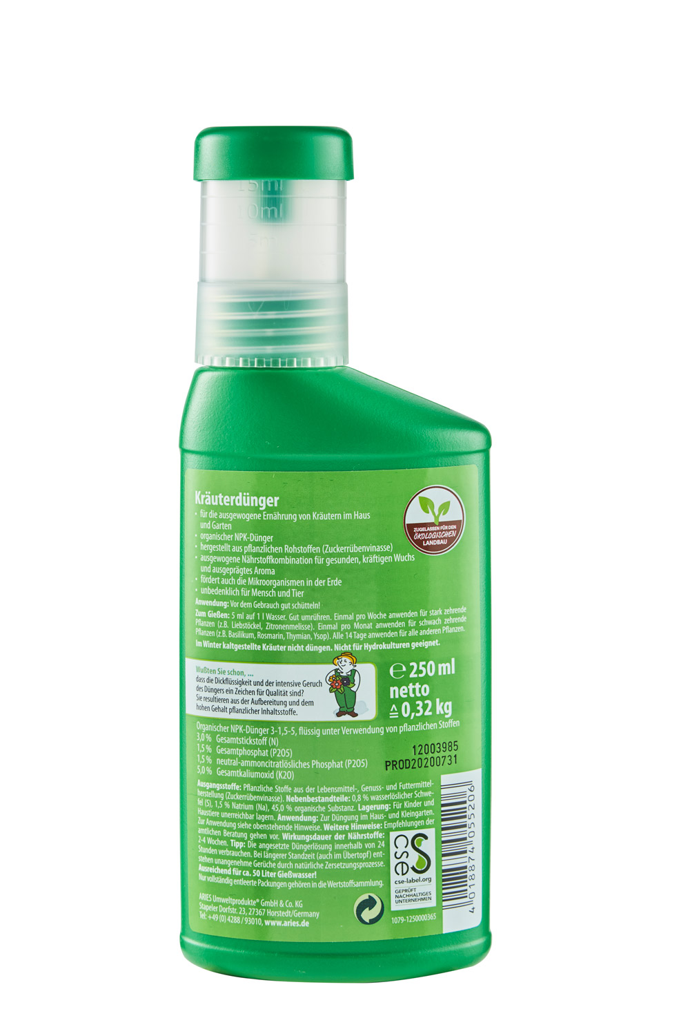 Schnell wirkender organischer NPK-Flüssigdünger 3-1-5 für die ausgewogene Ernährung von Kräutern in Haus und Garten. Unbedenklich für Mensch und Tier.
